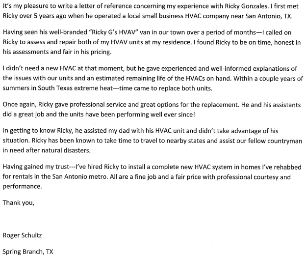 Wagner Home Services, Inc. is a Texas home remodeling contractor that has utilized Ricky Gonzalez’s company, Ricky G’s, for over 15 years. Ricky is a mastery of his trade in HVAC. I have known him in both a professional and personal capacity. He is extremely professional, trustworthy, personable and reliable. I have always been completely satisfied in every aspect of his services. I highly recommend Ricky for any HVAC project.