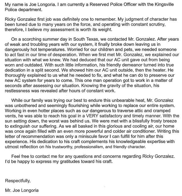 Mr. Ricky Gonzalez a HVAC Specialist has been servicing my A/C system for over 7 years. He is very honest, dependable, and conscientious, I totally recommend him for any service, repairs, and Installations on any HVAC Systems. Sorry to say he is no longer available in my area. Ricky G will be missed by all his customers!!